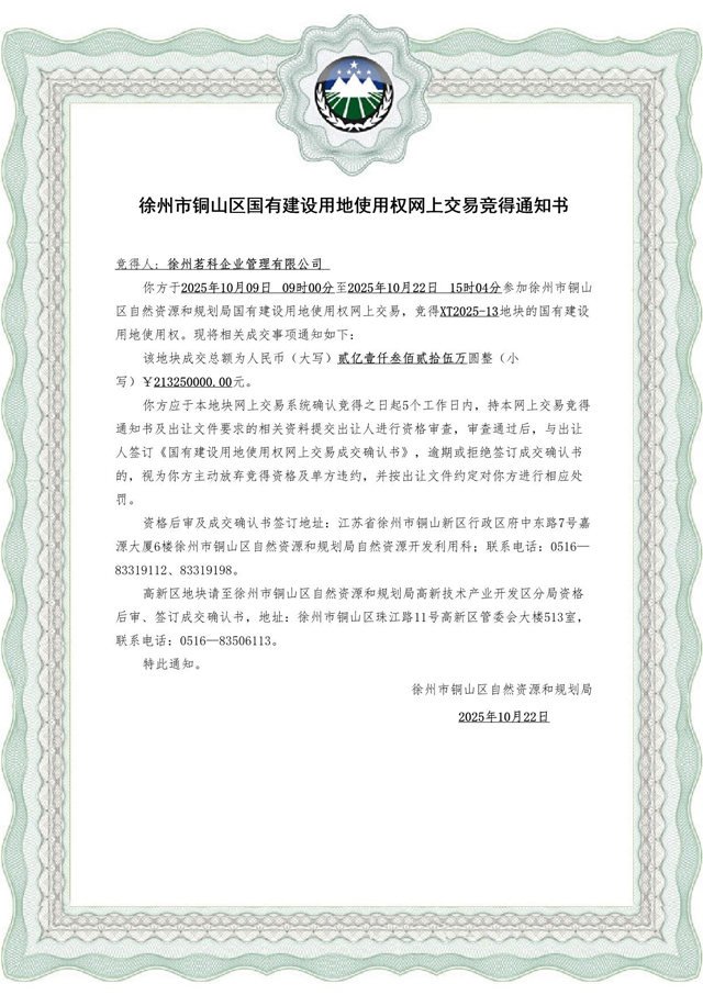 10月22日,由萬科全資子公司徐州茗科企業管理有限公司以底價2.1325億元摘牌徐州市銅山區萬達東C地塊,此次摘牌是繼2018年2月獲取的“新都會”項目及2024年1月獲取的“檐語間”項目后,公司在銅山區北京路板塊萬達片區獲取的又一宗優質住宅用地,為萬科在本板塊持續深耕、打造優質居住項目邁出堅實一步。